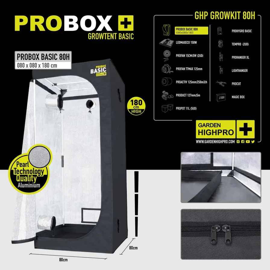 Das Growbox Komplettset 80x80 von Garden Highpro bietet optimale Bedingungen für das Indoor-Gärtnern, inklusive energieeffizienter LED-Beleuchtung und einem leistungsstarken Lüftungssystem zur effektiven Geruchseliminierung. Die hochwertige Growbox und Stofftöpfe fördern ein gesundes Pflanzenwachstum durch verbesserte Wurzelbelüftung. Mit umfassendem Zubehör wie Thermo-Hygrometer und mechanischen Zeitschaltuhren ist dieses Set ideal für Einsteiger, die sofort loslegen möchten.